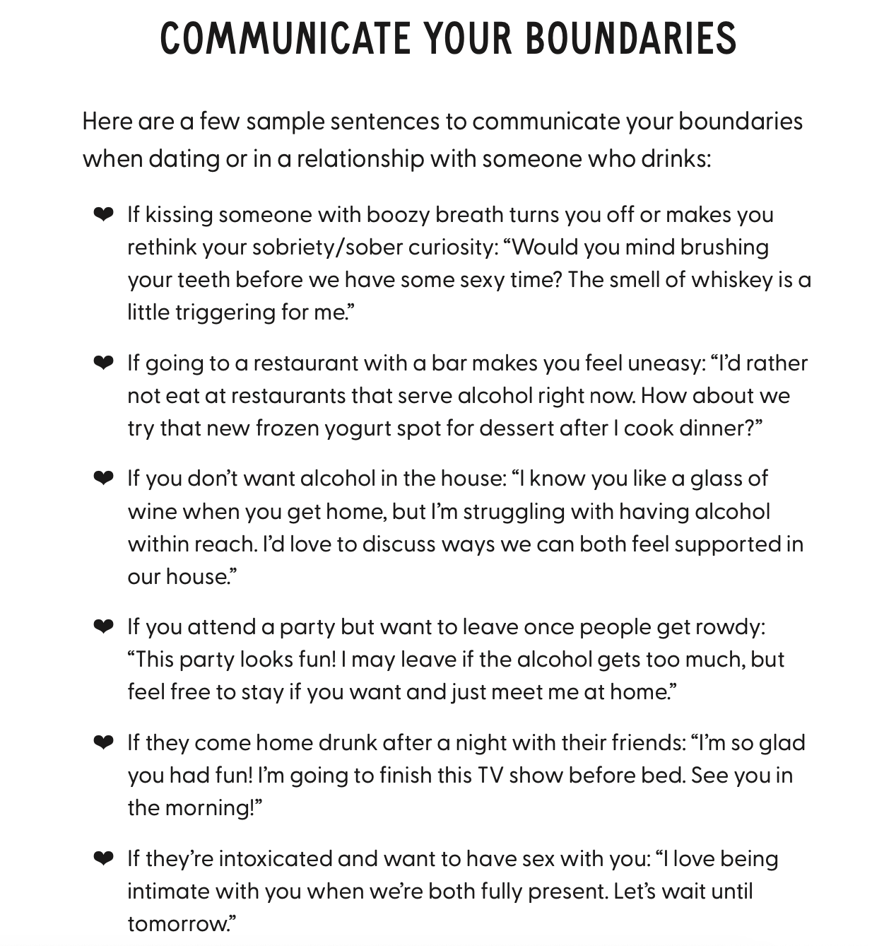 I’m also asked how to set boundaries in these types of scenarios. People generally understand the concept of boundaries, but they have no idea how to identify their own boundaries, let alone advocate for them—especially when it comes to dating or living with someone who drinks when you’re trying to get sober.